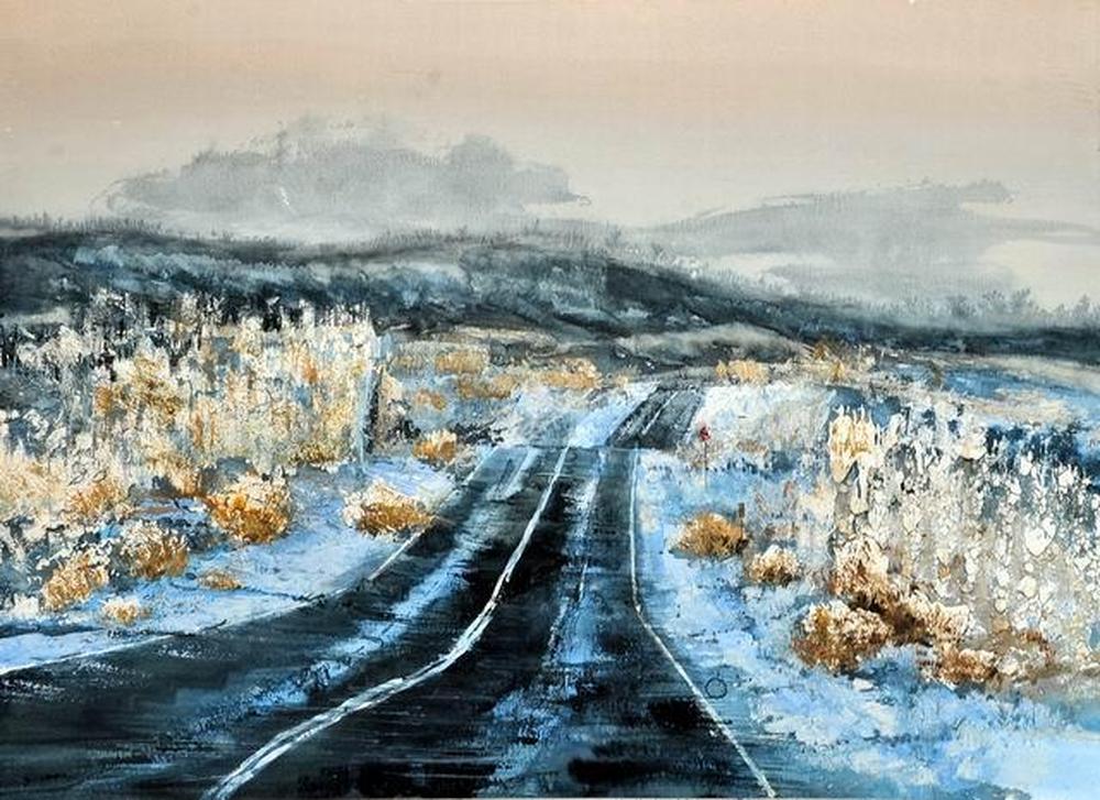 作品描绘冬季里山区山路的景色